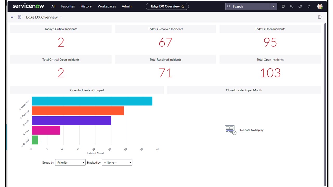 Companies that use ServiceNow as their starting point for ticket prioritization and dispersal can use the ServiceNow Edge DX Overview dashboard to view the number of open and resolved tickets.