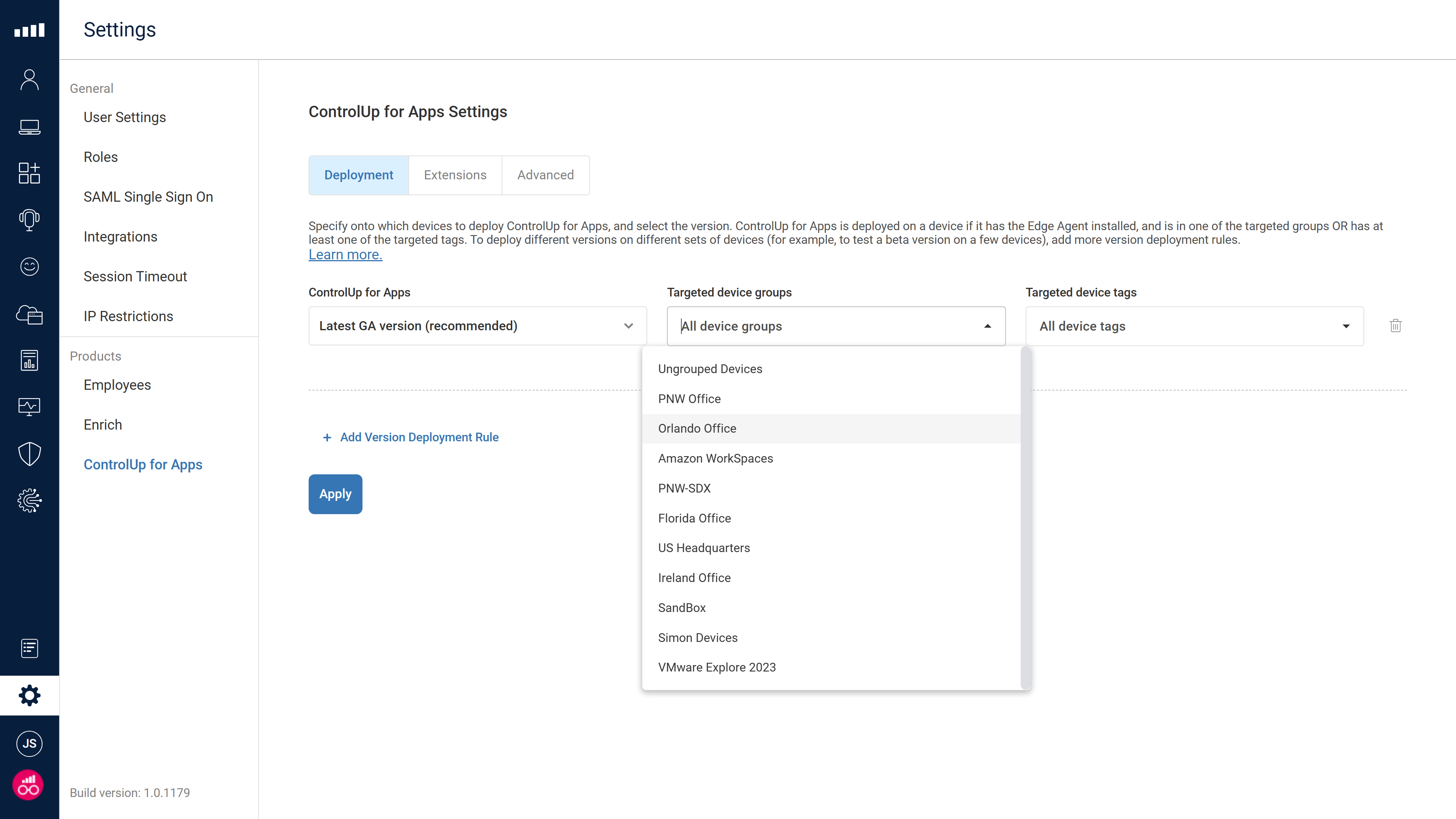 If you are not quite ready to push out the required components to all your devices, you can say no for steps 1 and 2 and just add the SaaS apps you use in your environment in step 3. Once you click Finish after step 3, you can go to the ControlUp for Apps settings page and configure your deployment settings more granularly, either using device groups or tags, very similar to the agent version control settings for ControlUp for Desktops.