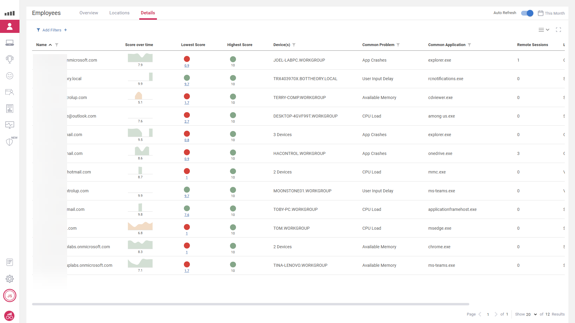 From this dashboard you can just follow the “breadcrumbs”, by either selecting a specific problem area such as “App Crashes” or by “following the red” all the way down to a specific user at a specific minute in time to understand what impacted their individual score.