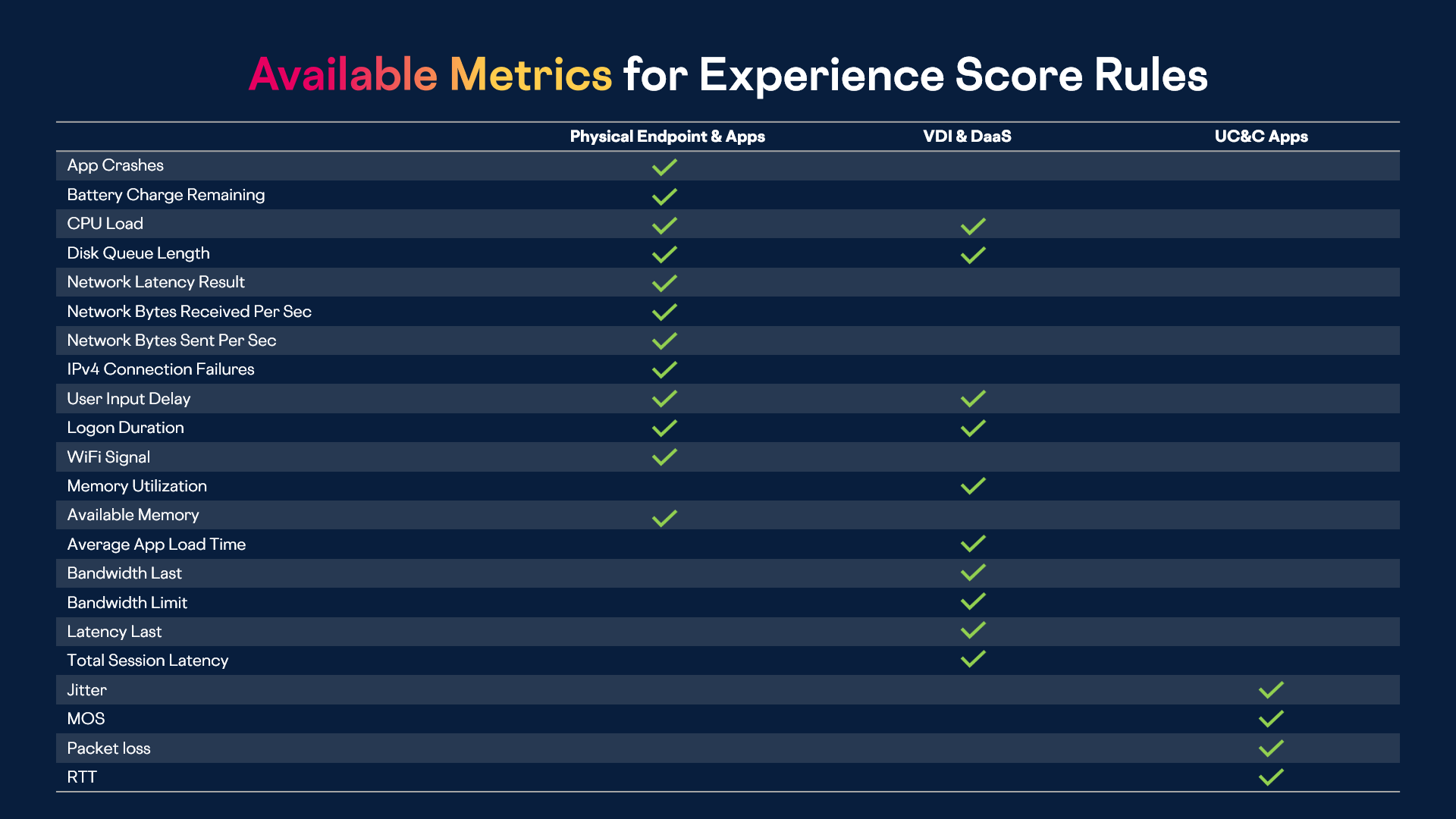 As is usual with ControlUp solutions, you can get immediate value without any complicated configuration or setup. Experience scores are calculated based on out-of-the-box scoring profiles that include device health and performance, application performance and issues, Unified Comms performance, and remote VDI & DaaS session performance. But we recognize that there is no “one size fits all”. Customers can fully customize how scores are calculated, including prioritizing apps that are more important, which metrics to include, what conditions need to be met to be included in score impact, and which devices should be targeted.