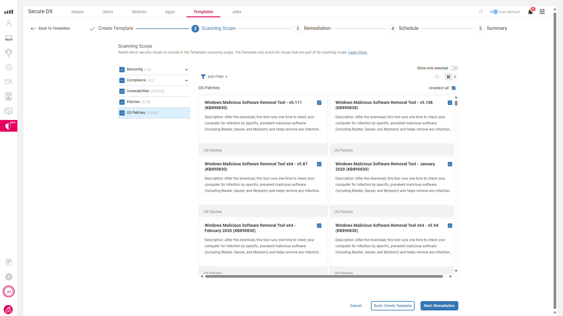 To use the OS patching feature in your environment, edit or add a new template, and select OS Patches in Scanning Scope and Remediation areas. Remember by clicking the root branch such as OS Patches, a new OS patch will automatically be added to the template to be scanned and remediated.
