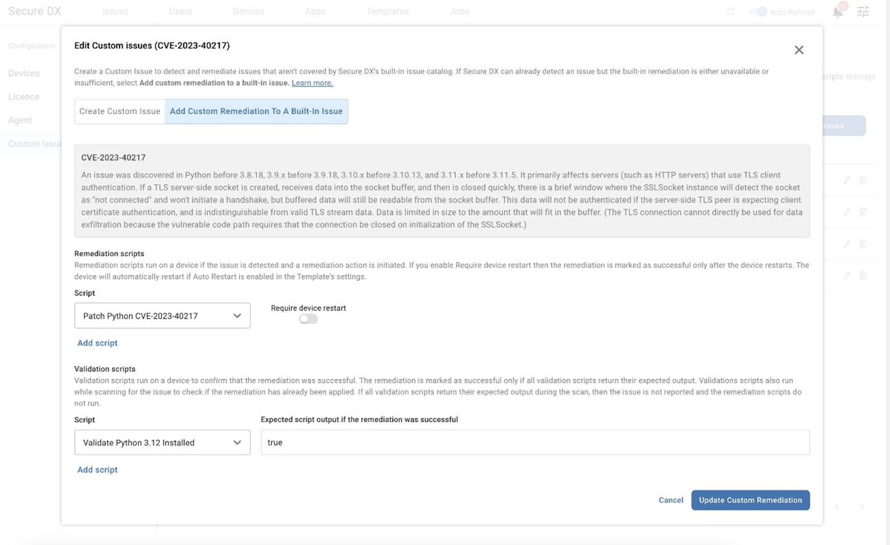 In the image below, ControlUp for Compliance has an entry in the catalog to scan for CVE-2023-40217 but there is no remediation for it. Your IT department has found a way to mitigate this vulnerability and has created a remediation script called Patch Python CVE-2023-40217. ControlUp for Compliance can use its built-in scanner to detect a security issue, and all you need to do is select a script to remediate the security issue.