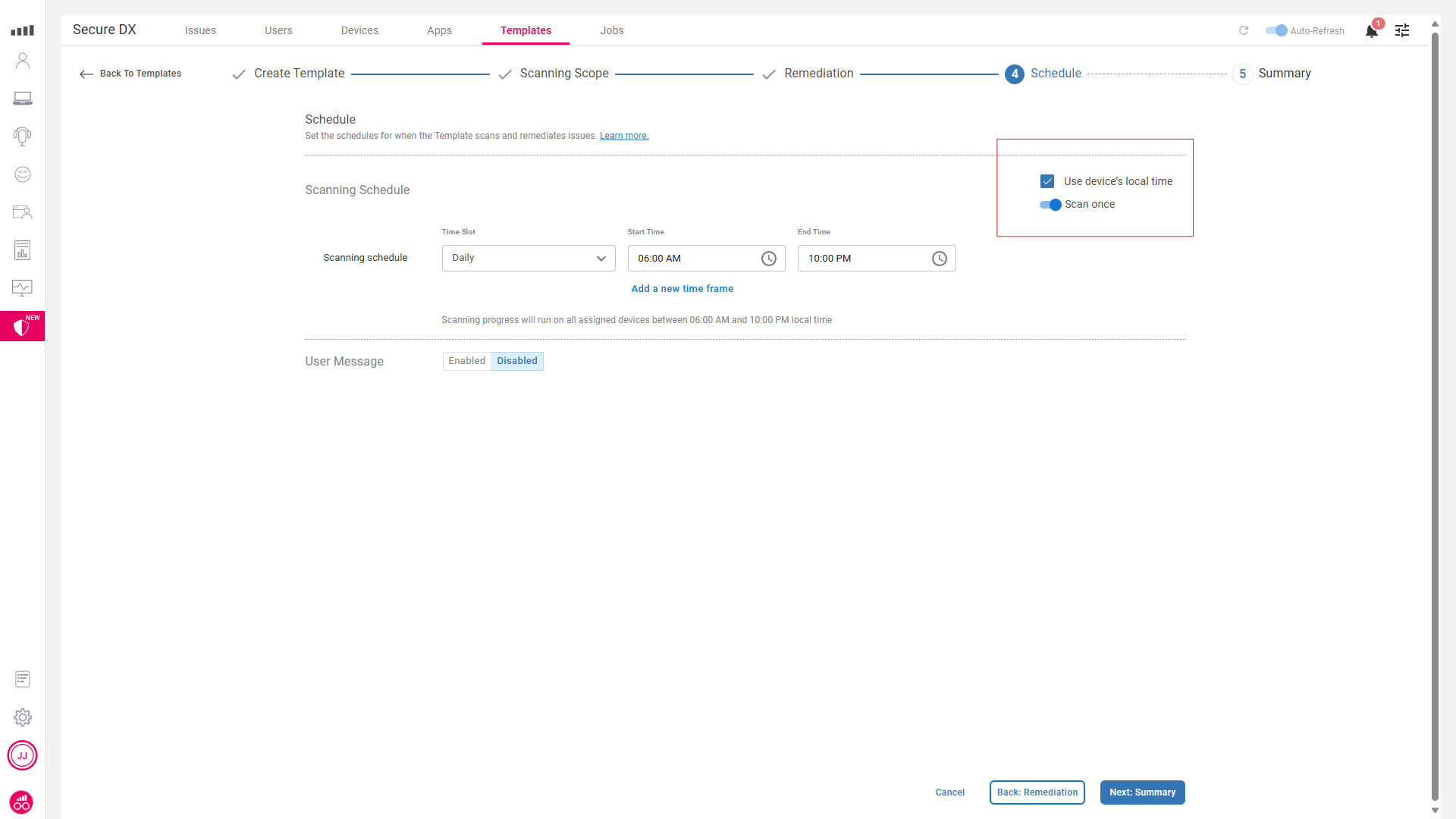 We have now included the ability to do a one-time scan to give IT the flexibility to scan and remediate many custom issues. Let’s say you need to search for a registry key or a file that may be on 5,000 computers across the world. These computers will be available at various times of the day, or maybe a few devices are off for a week while the users are on vacation. With a scan once switch, all 5,000 computers will only be scanned once, no matter how many times they log-in or reboot, saving CPU, RAM, and user experience.