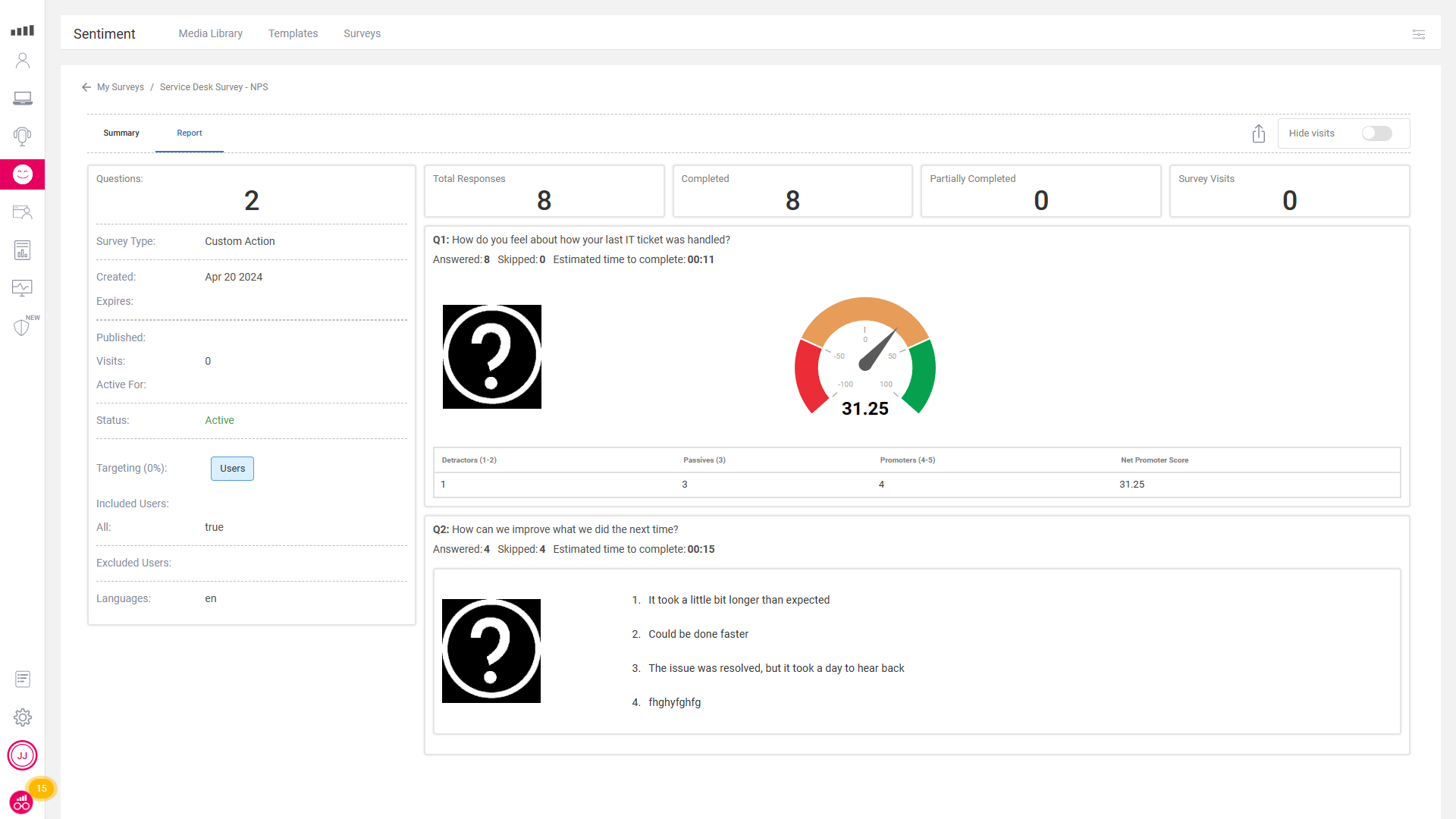 Control Up has built-in surveys that can be sent to all employees or triggered by a computer event. This gives your organization full control over who gets a survey, how often they get it, and even what languages it is in. It provides a complete breakdown of responses, surveys sent, and even NPS scores so you can fully understand the employee sentiment.