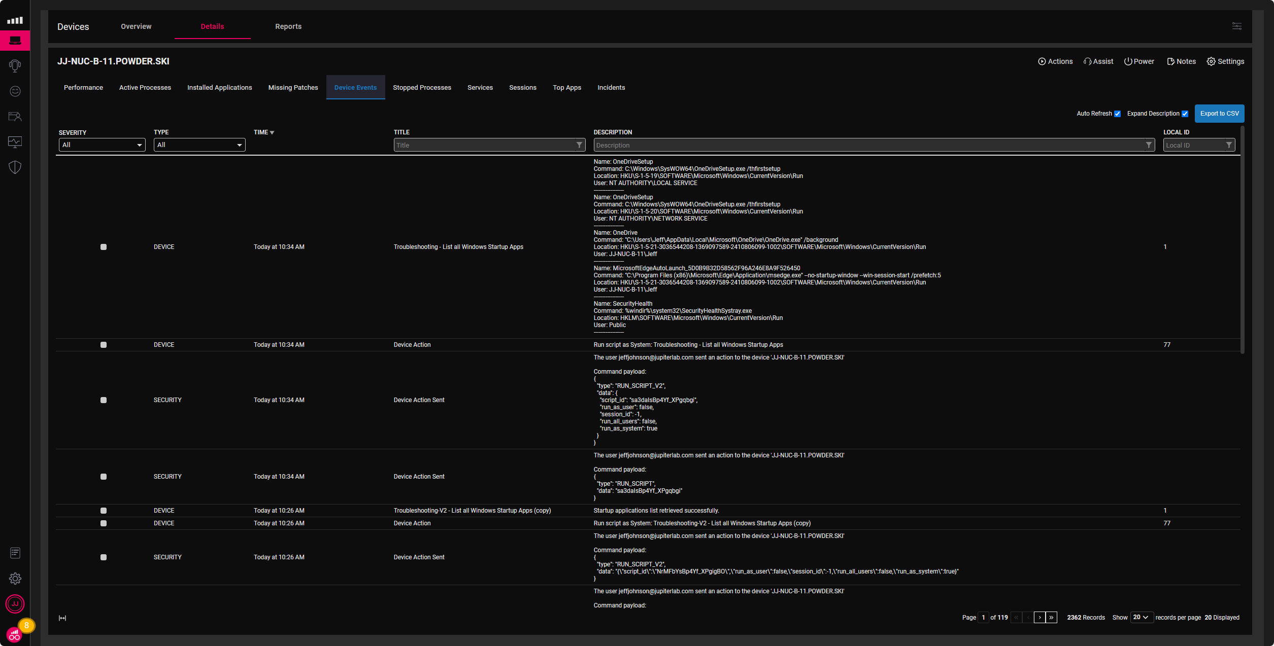 Once the above script is saved in the script library, it can be run simultaneously on one or many devices. In Figure Five, you can see the output of the above script in the Device Events for the computer called JJ-NUC-B-11. In the DESCRIPTION column, we can see the output of the startup applications.