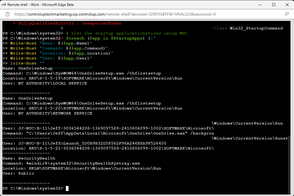 Figure 2 shows the script running in a remote shell against a Windows PC. The script’s output shows three programs that run at start-up, OneDrive, MicrosoftEdgeAutoLaunch, and SecuirtyHealth, along with the user context, such as username or public for all computer users.