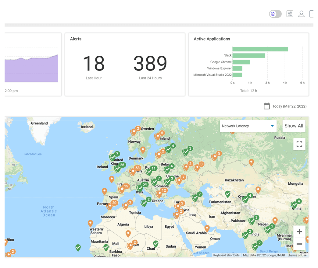 The Edge DX dashboard offers a comprehensive view of the health of all active employee physical desktops with the ability to focus on any specific desktop. The collected data is consolidated, encompassing various metrics such as the number of online devices, generated alerts, and active applications.