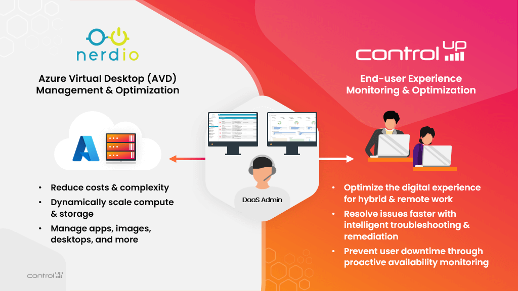 With Nerdio’s industry-leading AVD management and optimization solution and ControlUp’s digital employee experience management (DEX) platform customers get two best-of-breed solutions that make the life of their DaaS admins easier. The integration between our platforms will save you time while ensuring that your end-users have the best possible experience, without any disruptions.