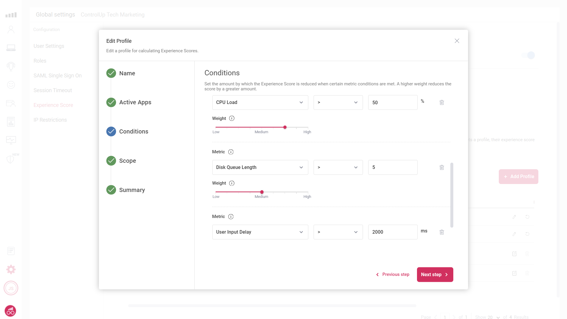 As is usual with ControlUp solutions, you can get immediate value without any complicated configuration or setup. Experience scores are calculated based on out-of-the-box scoring profiles that include device health and performance, application performance and issues, Unified Comms performance, and remote VDI & DaaS session performance. But we recognize that there is no “one size fits all”. Customers can fully customize how scores are calculated, including prioritizing apps that are more important, which metrics to include, what conditions need to be met to be included in score impact, and which devices should be targeted.