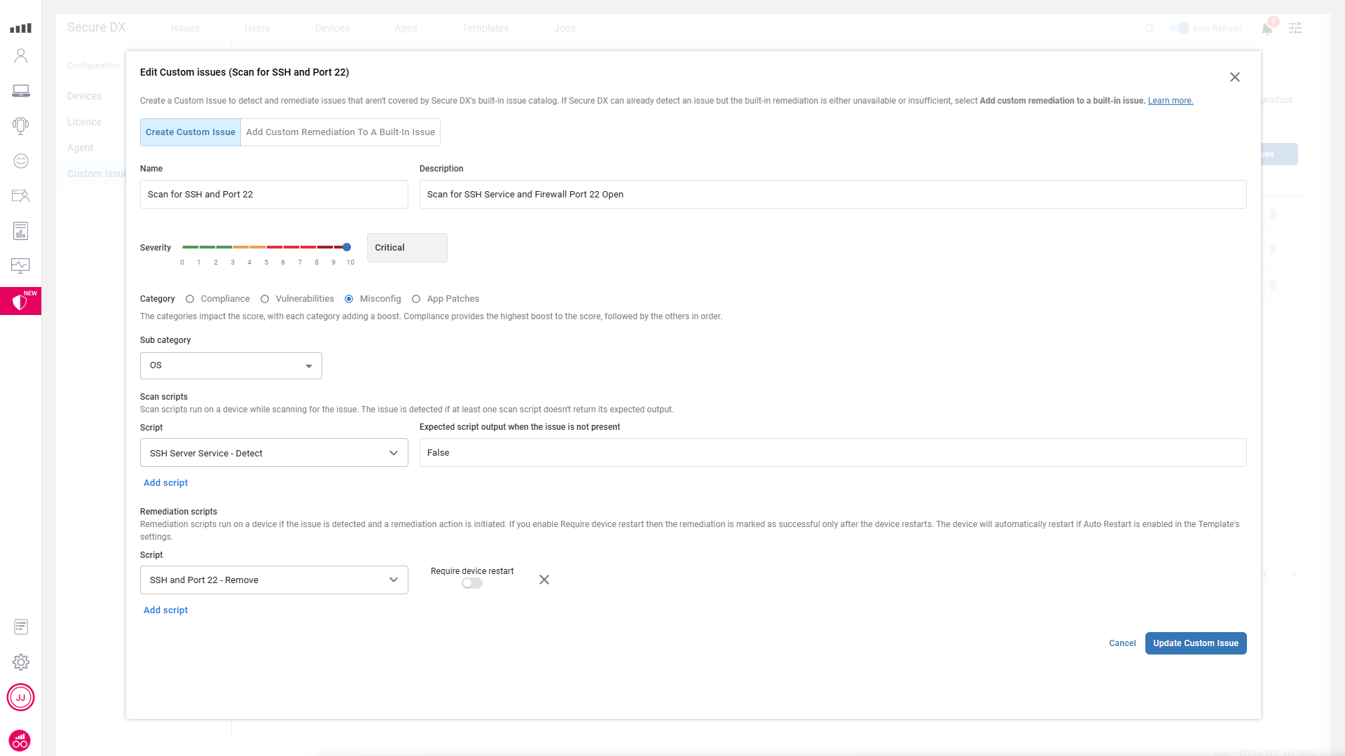Creating a custom scan for a security issue is great, but remediating a custom issue is even better. By adding a remediation script to a custom scan, you can easily find and fix any issue making your environment more secure. For instance, the scenario above looked for firewall port 22, a custom remediation would be to create another PowerShell script to de-install the SSH service and remove port 22 on the Windows Firewall.