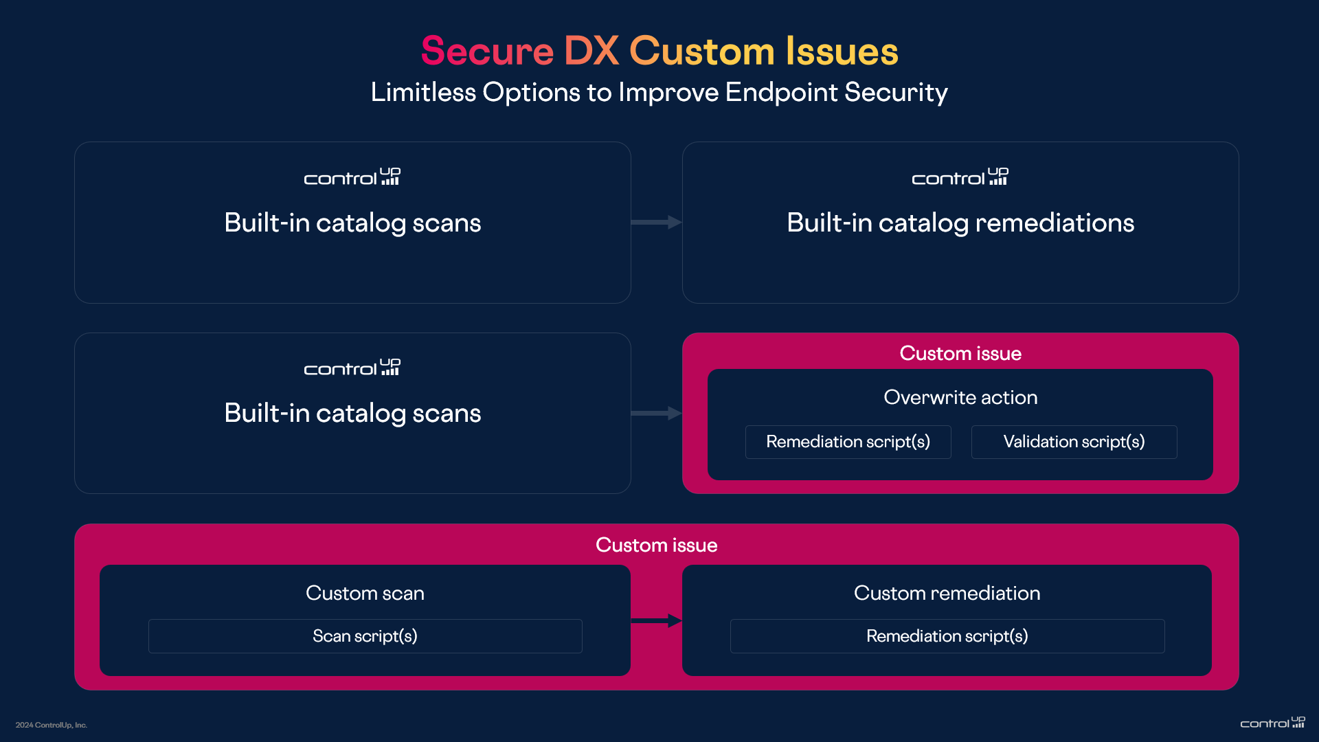 ControlUp ControlUp for Compliance is known for finding and remediating a wide array of operating system and application security issues. Sometimes there is no published remediation, or the issue is unique to your environment. ControlUp for Compliance can now detect and remediate custom security issues with a new feature called Custom Issues. Let’s see how to use custom actions to make your environment more secure, reduce risk, and lower security footprint.