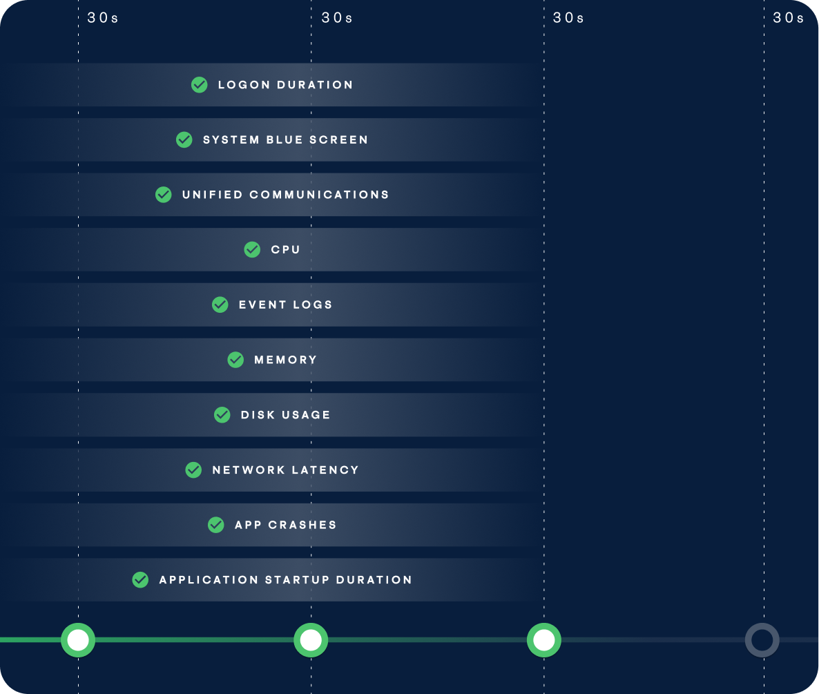 Don’t wait for a crash or user complaint to happen. ControlUp Connect silently analyzes performance metrics across CPU, memory, event logs, and more every 30 seconds. It alerts based on sustained breaches—not momentary blips—so “alert fatigue” is a thing of the past.